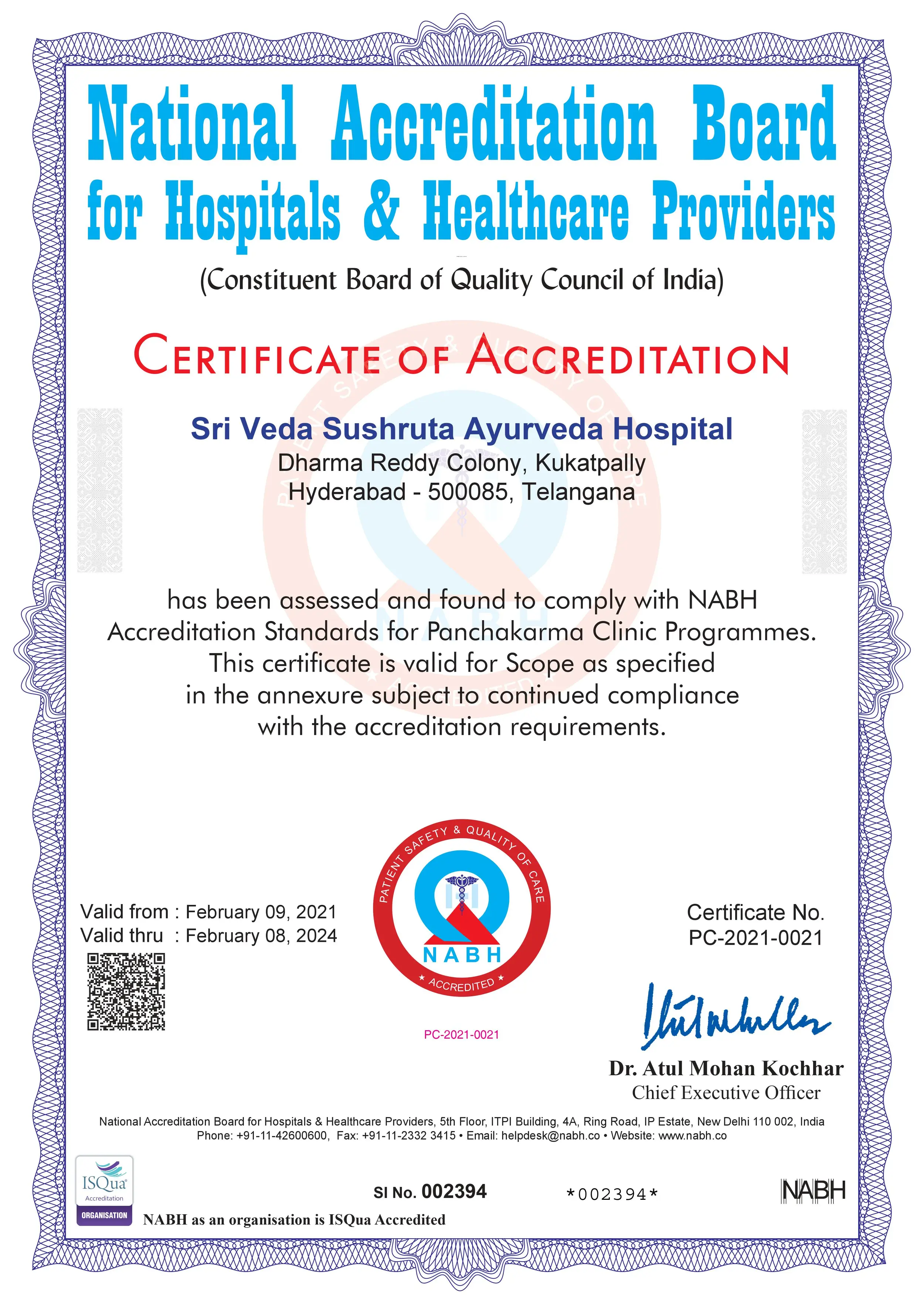Sushrutha Ayurveda Hospital run by Dr. Mahesh is accredited by NABH for the standards & compliances of it. This ensures that patients get the best care with highest standards.
